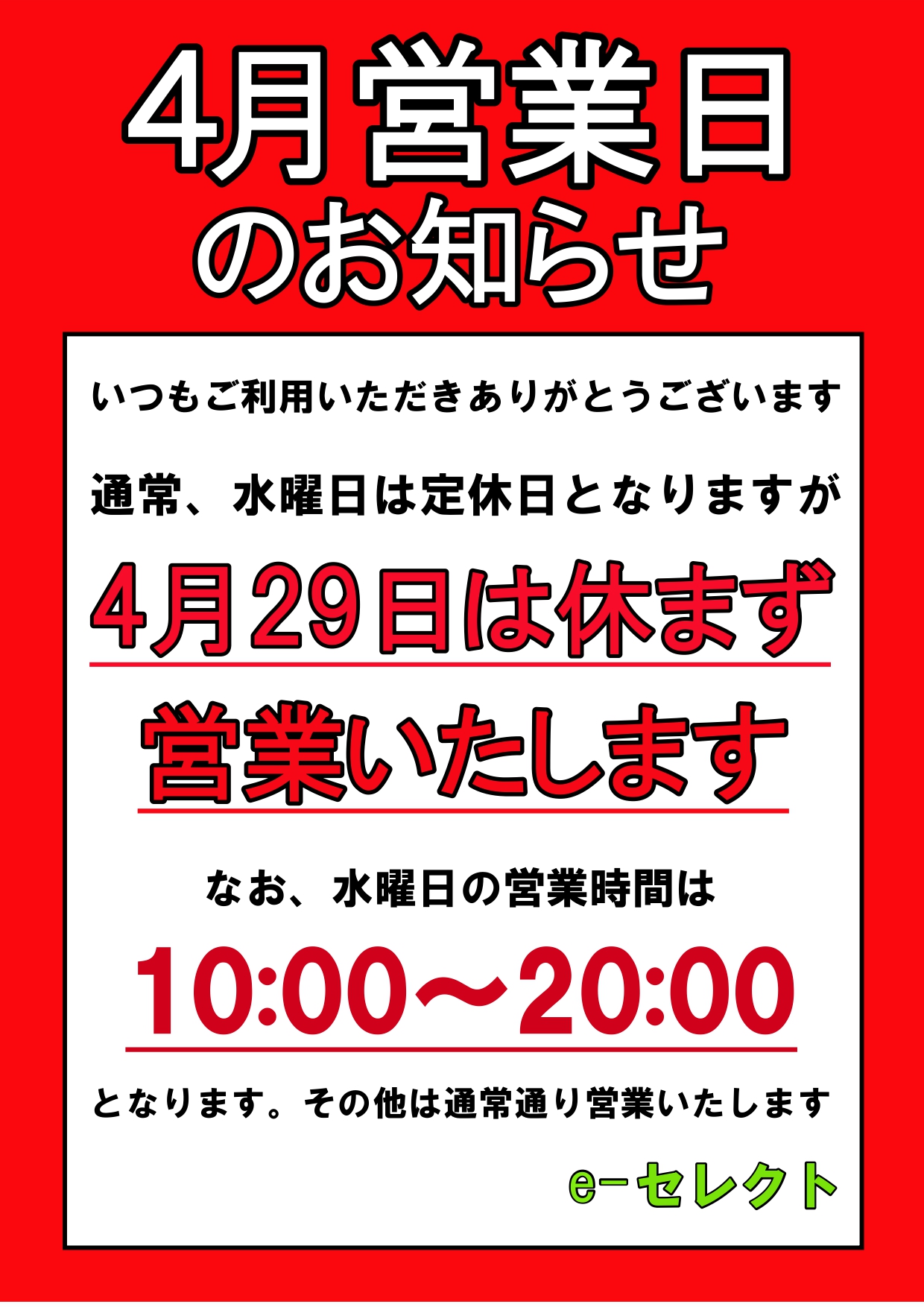 通常、水曜は定休日とさせていただいておりますが4月29日(水)は休まず営業いたいします。