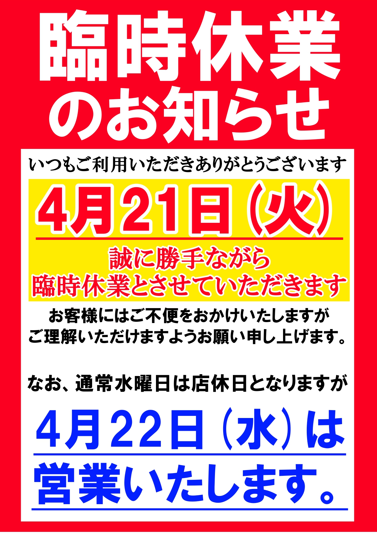 4月21日(火)は誠に勝手ながら臨時休業となります🆕